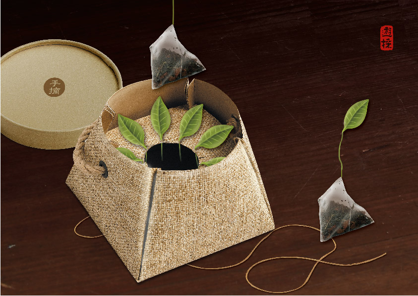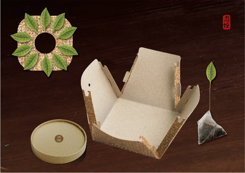 畫面強調「全手採茶」的概念,因此以手採茶的插畫圖像,強調茶葉全手工製作、採茶時的竹簍與竹簍篩。包裝結構上,以紙板拼接、卡榫方式而成,沒有任何一點黏膠,讓包裝體現品牌理念。