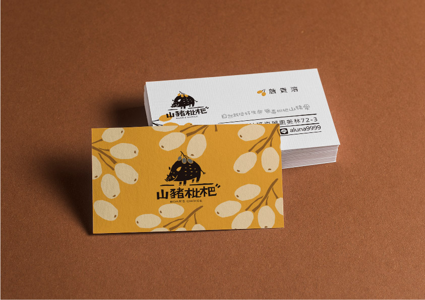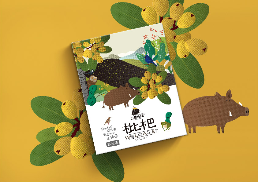 相傳在天冷每當枇杷熟成時,總會有群山豬前往採收,但他們未曾交貨過,此為山豬枇杷之緣由,整體品牌形象便以山豬枇杷的故事做為發想,商標設計以童趣的插畫詮釋品牌的純真天然,同時為了讓這隻山豬更有品牌的連結性,讓這隻採收不交貨的山豬身上放著枇杷,並露出微笑,暗喻枇杷的甜美令山豬的愛不釋手,賦予品牌可愛的想像,更呼應了「自然栽培好生態,無毒枇杷山豬愛」,表達整體生態的共生共榮。