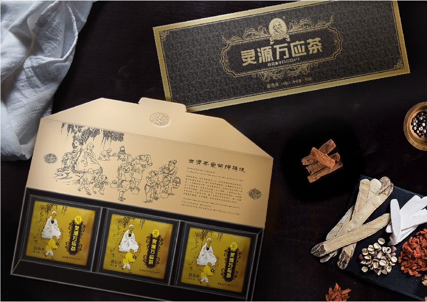 將沐講禪師以靈源萬應茶濟世救人的身影呈現於包裝上,使靈源的品牌故事栩栩如生,緬過往情懷、憶時光悠揚,以時光的老故事刷亮品牌,建立靈源藥業的全新氣象。