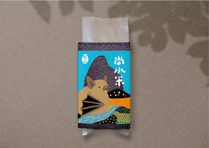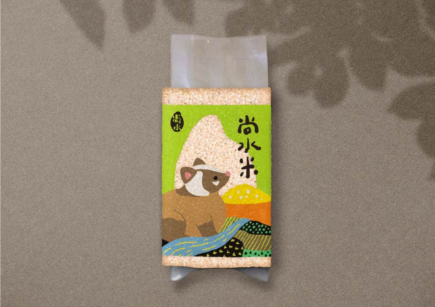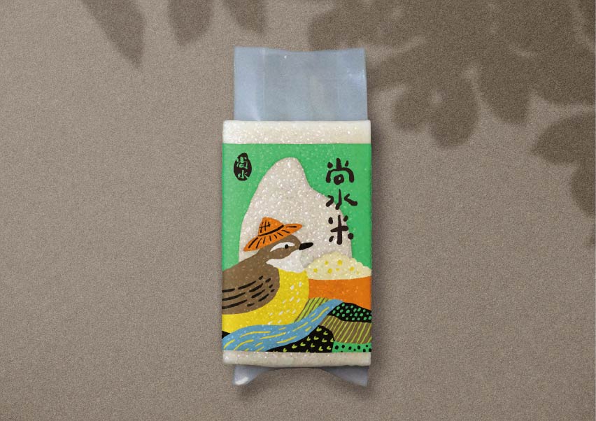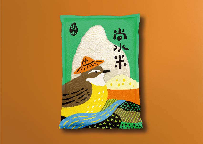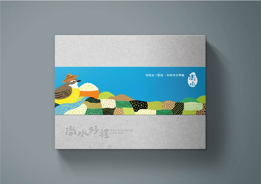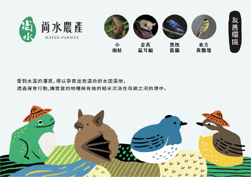 尚水位於溪州,濁水溪沖積而成的肥沃黑泥濕地孕育而成,設計上便以「溪州濕地復育計畫中的生態島」概念為靈感,運用尚水所復甦的保育動物:東方黃鶺鴒、小雨蛙、黑枕藍鶲、金黄鼠耳蝠來代言,成為無給職的產品代言人,突顯物種多樣性與友善耕作。