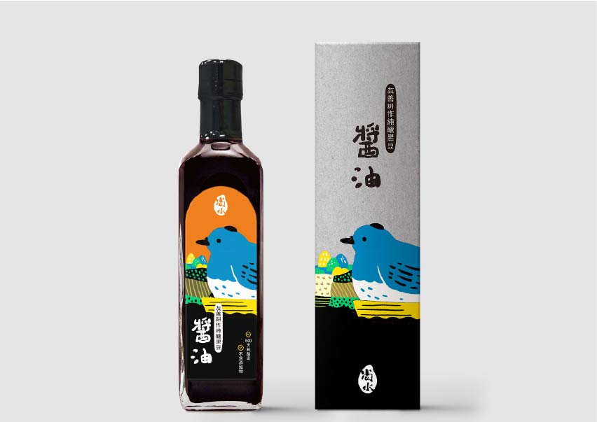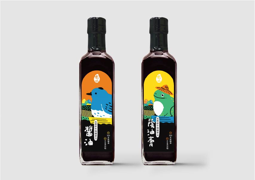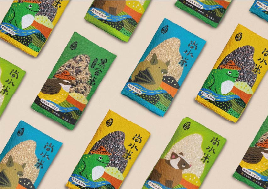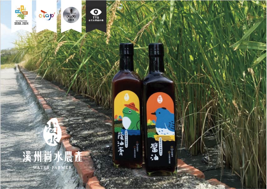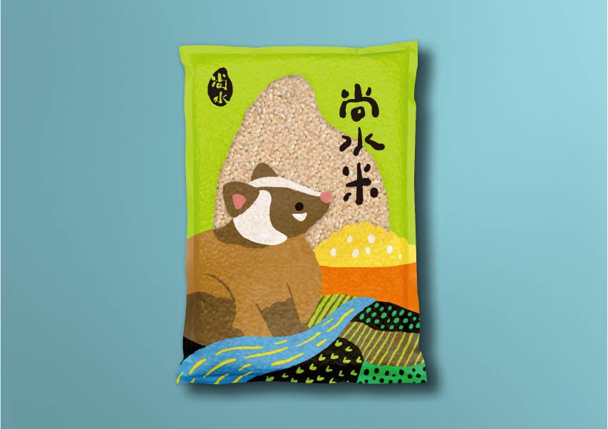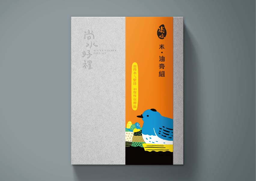 尚水位於溪州,濁水溪沖積而成的肥沃黑泥濕地孕育而成,設計上便以「溪州濕地復育計畫中的生態島」概念為靈感,運用尚水所復甦的保育動物:東方黃鶺鴒、小雨蛙、黑枕藍鶲、金黄鼠耳蝠來代言,成為無給職的產品代言人,突顯物種多樣性與友善耕作。